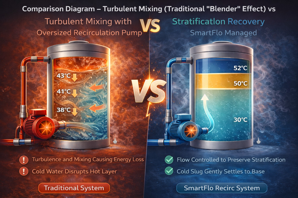 This is why we developed SmartFlo. It is an IoT-based physical product designed to move recirculation from a background function to a precision-engineered process. SmartFlo doesn't just "move water"; it manages the invisible physics of the tank. By optimizing inlet conditions and using intelligent feedback loops that account for sensor inertia, SmartFlo ensures your system protects its most valuable asset: Thermal Stratification.